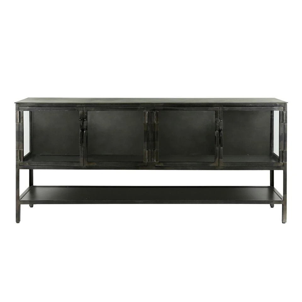 De Rory serie van het geliefde woonmerk Fraaai bestaat uit een nachtkastje, een dressoir en een wandkast. De gehele serie is gemaakt van metaal. Dit geeft de meubels een stoere uitstraling. Het dressoir heeft een afmeting van 180x40x80 cm en is voorzien van vier glazen deuren. Het dressoir biedt daarmee voldoende ruimte om spulletjes op te bergen. Daarnaast heeft het dressoir over de gehele lengte nog een legplank onder de kastjes. Voldoende ruimte om uw mooiste accessoires te presenteren. De gehele serie is af te nemen met een lichtvochtige doek. Het dressoir weegt 71,5 kg. Met deze serie kun je alle kanten op en creëer je binnen een handomdraai een nieuwe look.