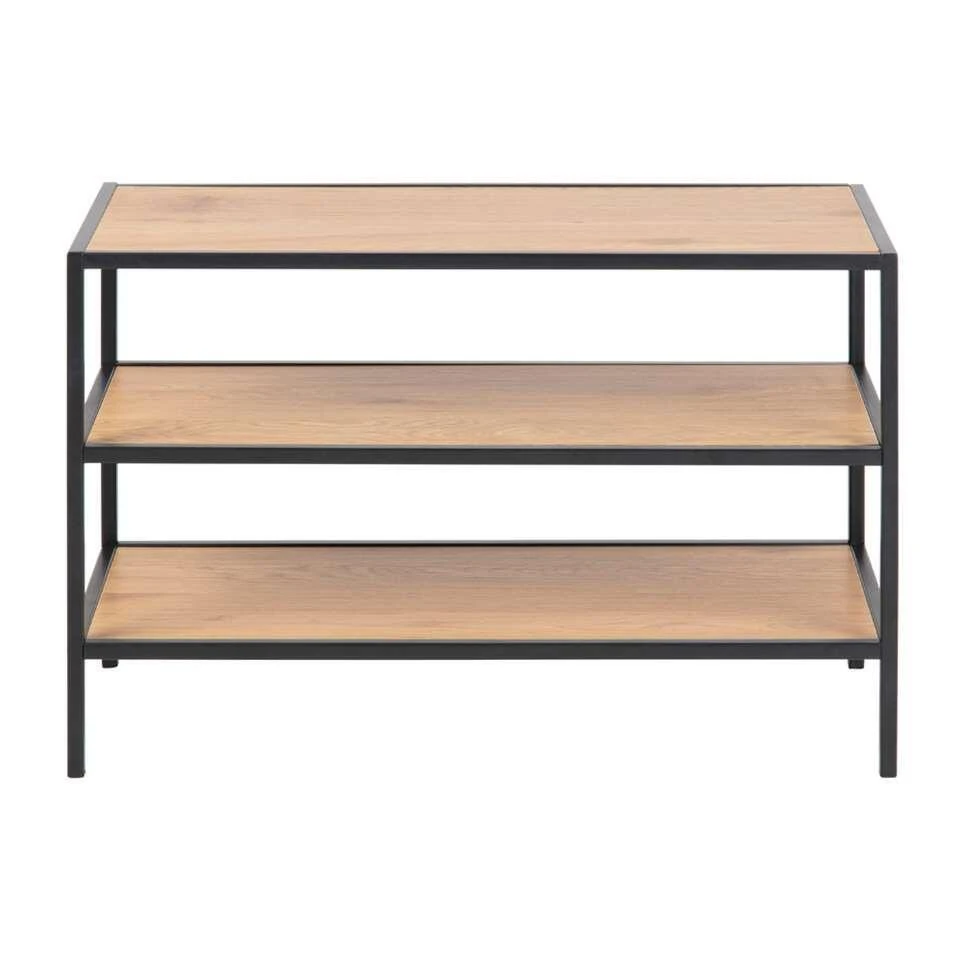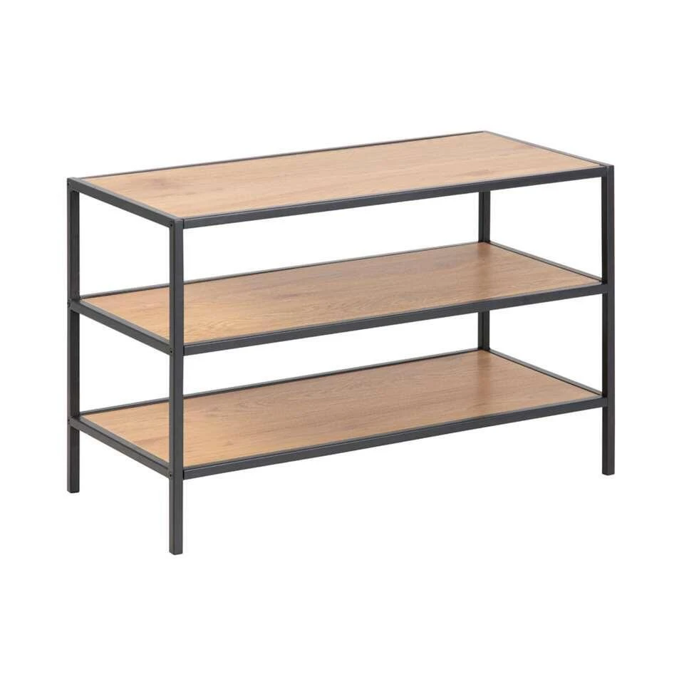 Schoenenrek Nox heeft een stoere eikenkleur en een afmeting van 50x77x35 cm. Dit rek heeft 3 planken. Het frame is gemaakt van metaal dat is afgewerkt met een zwarte poedercoating. Een handig rek voor in de gang, de bijkeuken of in je inloopkast.