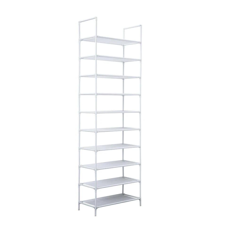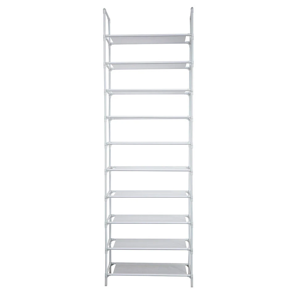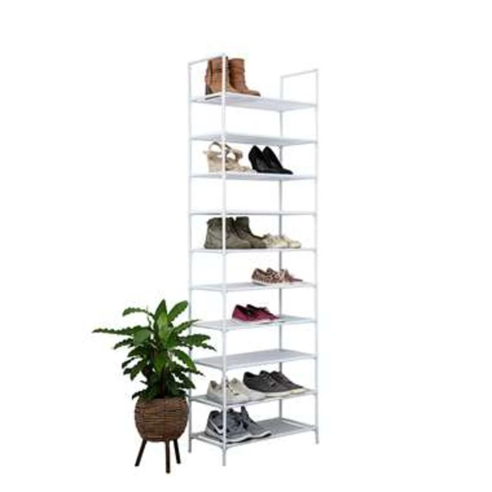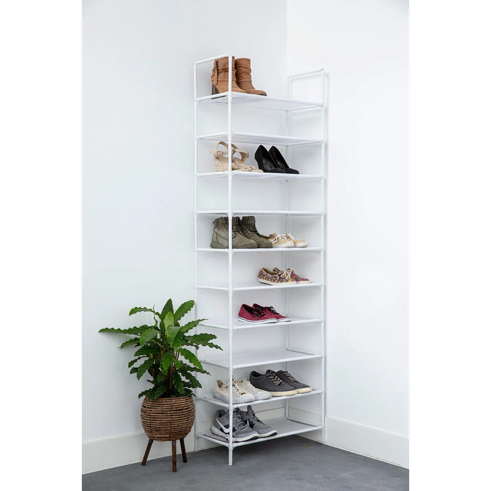 Met dit witte metalen schoenenrek geef je 20 paar schoenen een mooie plek in huis. Stevig en hoog, ideaal wanneer je veel schoenen in en kleine ruimte netjes wilt opbergen. Het vlies van de schappen is waterafstotend waardoor water van natte schoenen niet intrekt. Vuil als stof en zand veeg je bovendien gemakkelijk af met een vochtige doek. De poten zijn van kunststof zodat je geen krassen maakt op je vloer. Je zet het schoenenrek snel en makkelijk in elkaar. Het rek is verplaatsbaar, maar kan voor extra stevigheid ook met de bijgeleverde pluggen aan de muur worden bevestigd.