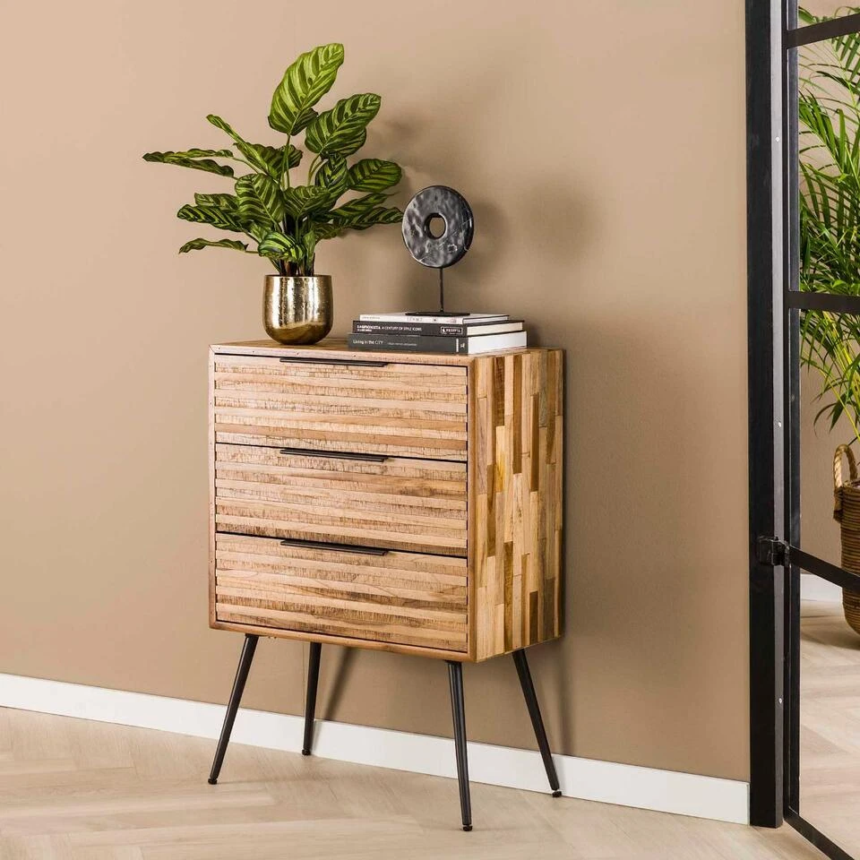 Sema ladekast 3 lades teakhout is uitgevoerd in verweerd teakhout, gelegd in strookjes met aan de voorzijde opgelegde strips van hetzelfde hout. Dit geeft een heel eigentijds en speels effect aan het kastje. De tapse pootjes zijn uitgevoerd in metaal. Deze betaalbare ladekast heeft 3 lades die van binnen zijn afgewerkt met glad hout in een donker grijze kleur. De ladekast maakt onderdeel uit van de Sema serie. De serie heeft een natuurlijke en warme uitstraling. De Sema-serie bestaat uit een nachtkastje, een haltafel, tv meubel en twee ladekasten (met drie lades of zes lades). Combineer deze diverse meubels voor eenheid binnen het interieur.