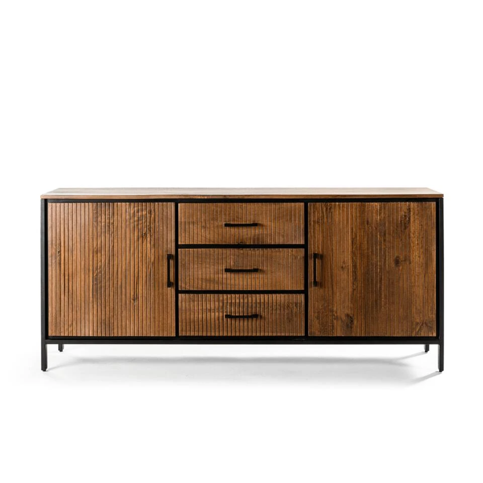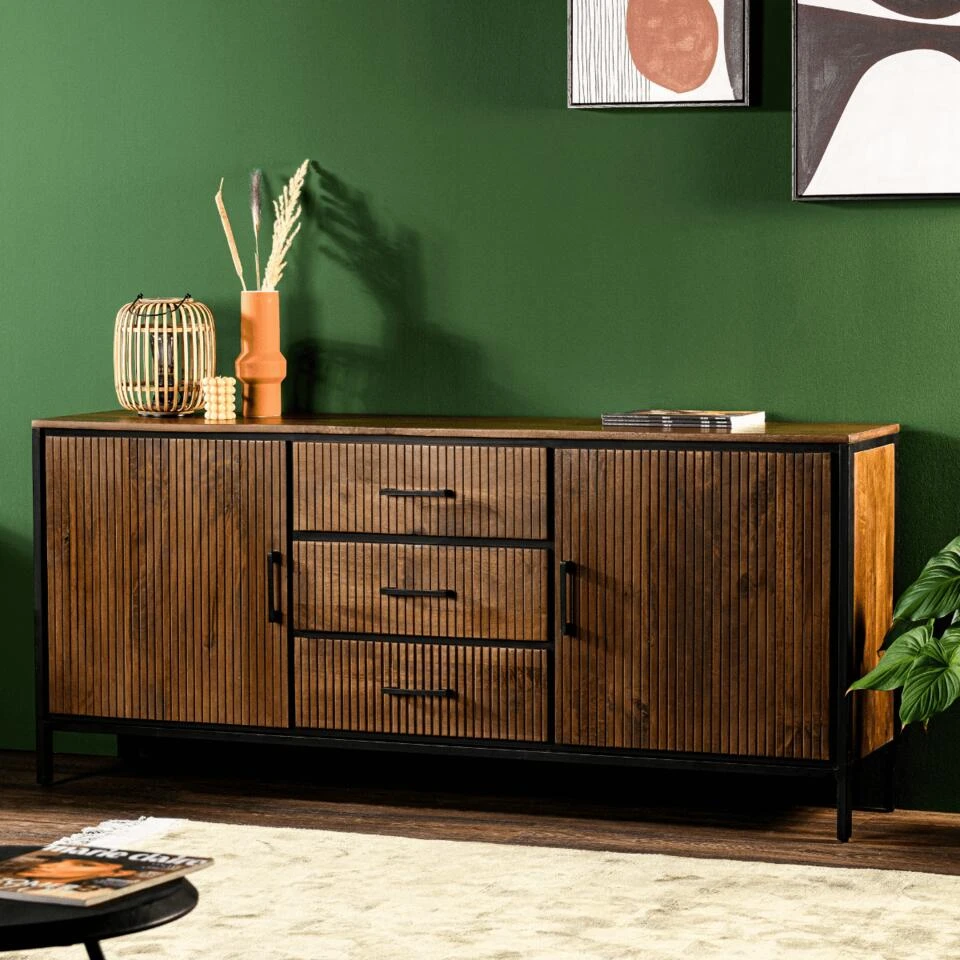 De Seno Dressoir is een prachtige meubelstuk dat je interieur een industriele karakter geeft. Dit dressoir is vervaardigd van hoogwaardig acaciahout met een warme bruine kleur en is voorzien van zwarte metalen accenten. Het dressoir heeft een lengte van 180cm en komt weg van het woonmerk Vurna. Dit dressoir heeft twee grote opbergruimtes en in het midden drie lades. Hierdoor is er voldoende ruimte om jouw producten op een efficiënte en overzichtelijke manier op te bergen. De deurtjes van de kasten hebben een ribbel effect, wat zorgt voor een speels effect en een mooie afwisseling in het strakke design. Naast opbergen, kan de Seno Dressoir ook worden gebruikt om jouw favoriete accessoires tentoon te stellen. Denk bijvoorbeeld aan mooie fotolijstjes, planten of andere decoratie items. Zo kun je het dressoir gebruiken als een echte blikvanger in jouw interieur. Het dressoir staat op vier slanke metalen poten, waardoor het meubelstuk een luchtige uitstraling heeft. De combinatie van het warme acaciahout en het zwarte metaal zorgt voor een stoer en eigentijds uiterlijk, dat perfect past in een industrieel of landelijk interieur. Al met al , de Seno Dressoir is een prachtige en praktische kast die perfect past in een interieur met een industriële of landelijke uitstraling. Het dressoir is vervaardigd van hoogwaardig acaciahout en voorzien van zwarte metalen accenten, heeft voldoende opbergruimte en is ook ideaal om decoratieve items op te tonen. De ribbel effect in de deurtjes en de slanke poten geven het dressoir een speelse uitstraling.