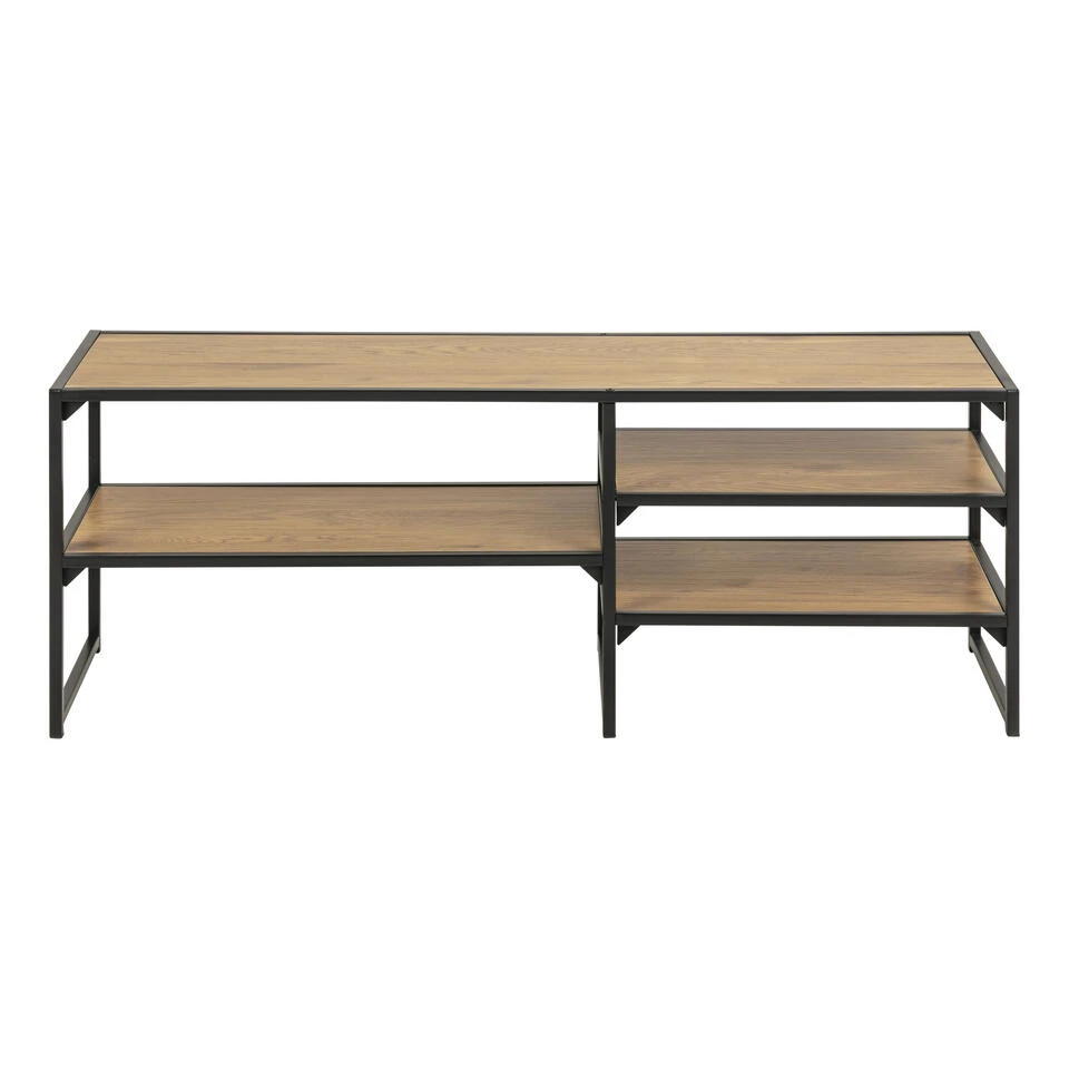 Een tv-meubel dat gekenmerkt wordt door een rechtlijnig ontwerp en open opbergruimte voor je entertainmentmedia. Gemaakt in moderne industriële stijl, heeft het een zwart metalen frame en 3 planken in een wilde eiken look. De asymmetrische positie van de planken verhoogt ook het visuele belang. Zo’n combinatie brengt een contrasterend element in de kamer en houdt je media in de schijnwerpers.