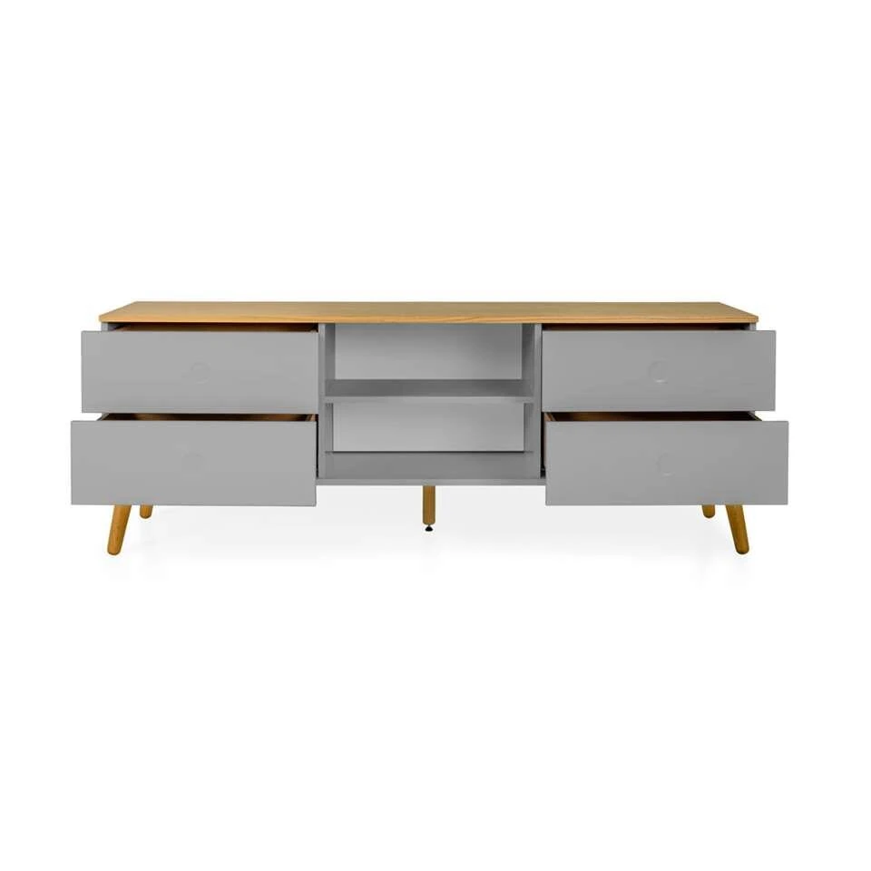 Tenzo tv-meubel Dot is grijs met eiken en heeft een afmeting van 60x162x43 cm. Dit tv-meubel heeft een breede van 162 centimeter. Zet apparatuur in de twee open compartimenten en berg films, opladers en rommel netjes weg in de 4 lades. Op het bovenblad is plaats voor een riant televisiescherm en misschien zelfs nog leuke decoraties.Dit televisiemeubel wordt gekenmerkt door een minimalistische design met Scandinavische look.