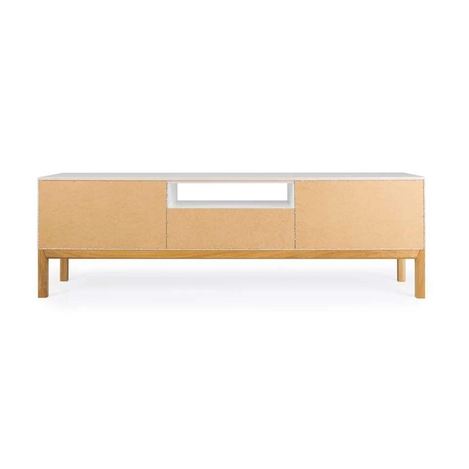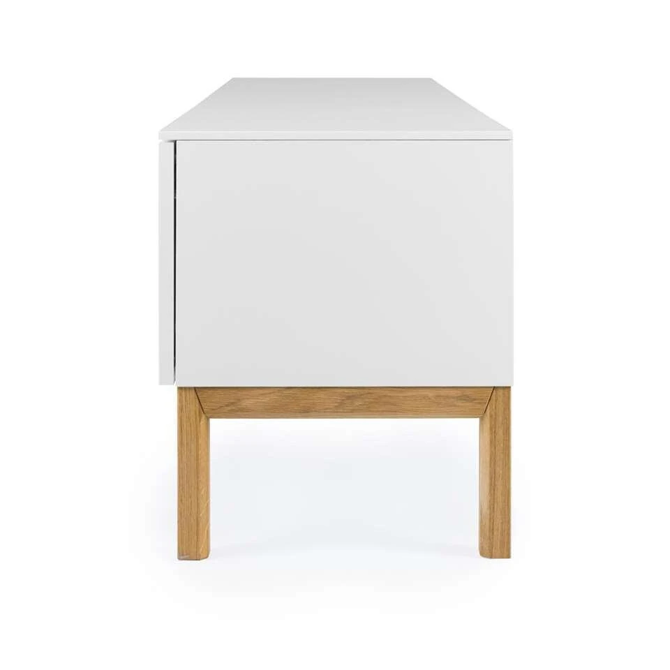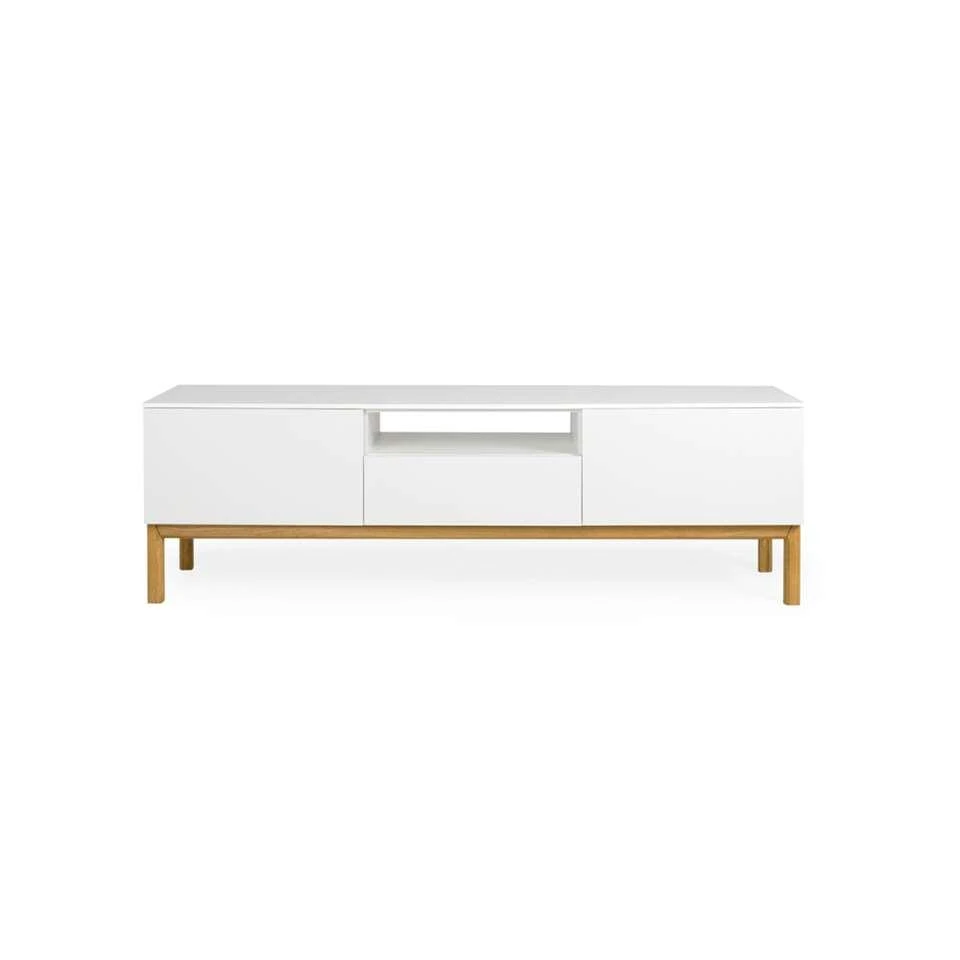 Tenzo tv-meubel Patch is een kast in moderne stijl. Het tv-meubel is wit met eikenkleur: het onderstel is eikenkleur, de kast zelf is wit. De tv-kast biedt voldoende mogelijkheden. Het open vak is uitermate geschikt voor het plaatsen van je receiver, HD-ontvanger of een router. De gesloten vakken kun je gebruiken om diverse spulletjes netjes achter op te bergen. Tv-meubel Patch heeft een totale afmeting van 56x179x47 cm.