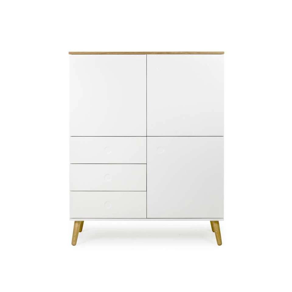 Tenzo wandkast Dot is wit met eiken en heeft een afmeting van 137x109x43 cm. Deze wandkast biedt veel opbergruimte. Gebruik deze wandkast voor administratie, spelletjes en post in de woonkamer. Je kunt deze kast ook in de eetkamer zetten en er serviesgoed in zetten. Deze kast wordt gekenmerkt door een minimalistische design met Scandinavische look.