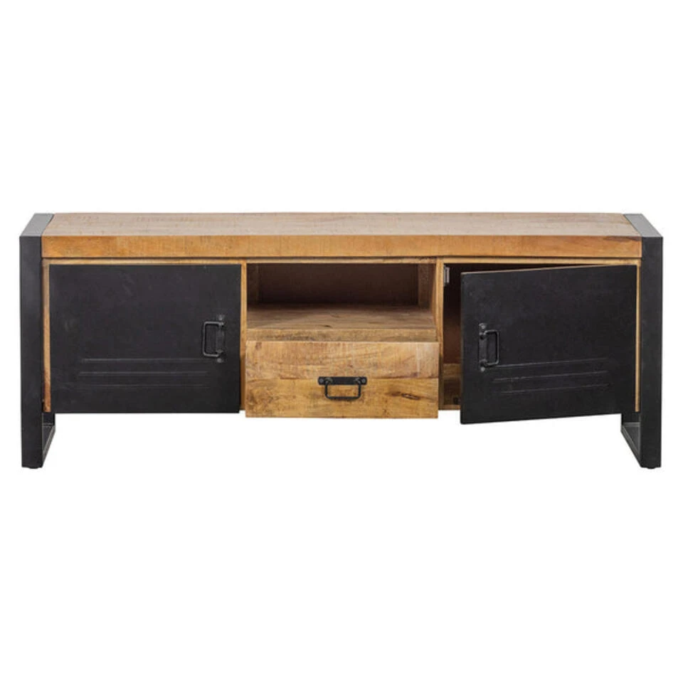 Het Mangohouten Birmingham TV Meubel zou door zijn ontwerp rechtstreeks uit het verleden kunnen zijn gekomen. Dit stoere televisiemeubel is perfect voor ieder interieur door de robuuste combinatie van mangohout en zwart gepoedercoat staal, wat u een warm en thuis gevoel.