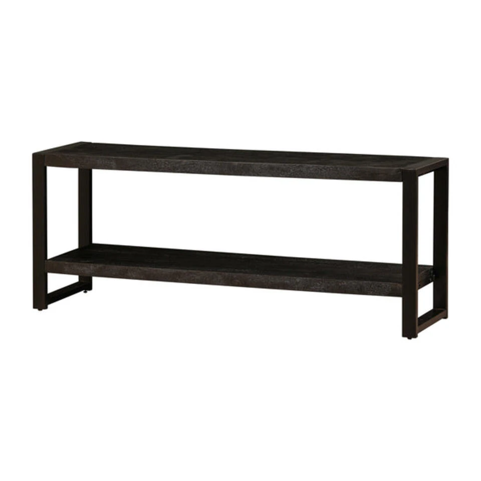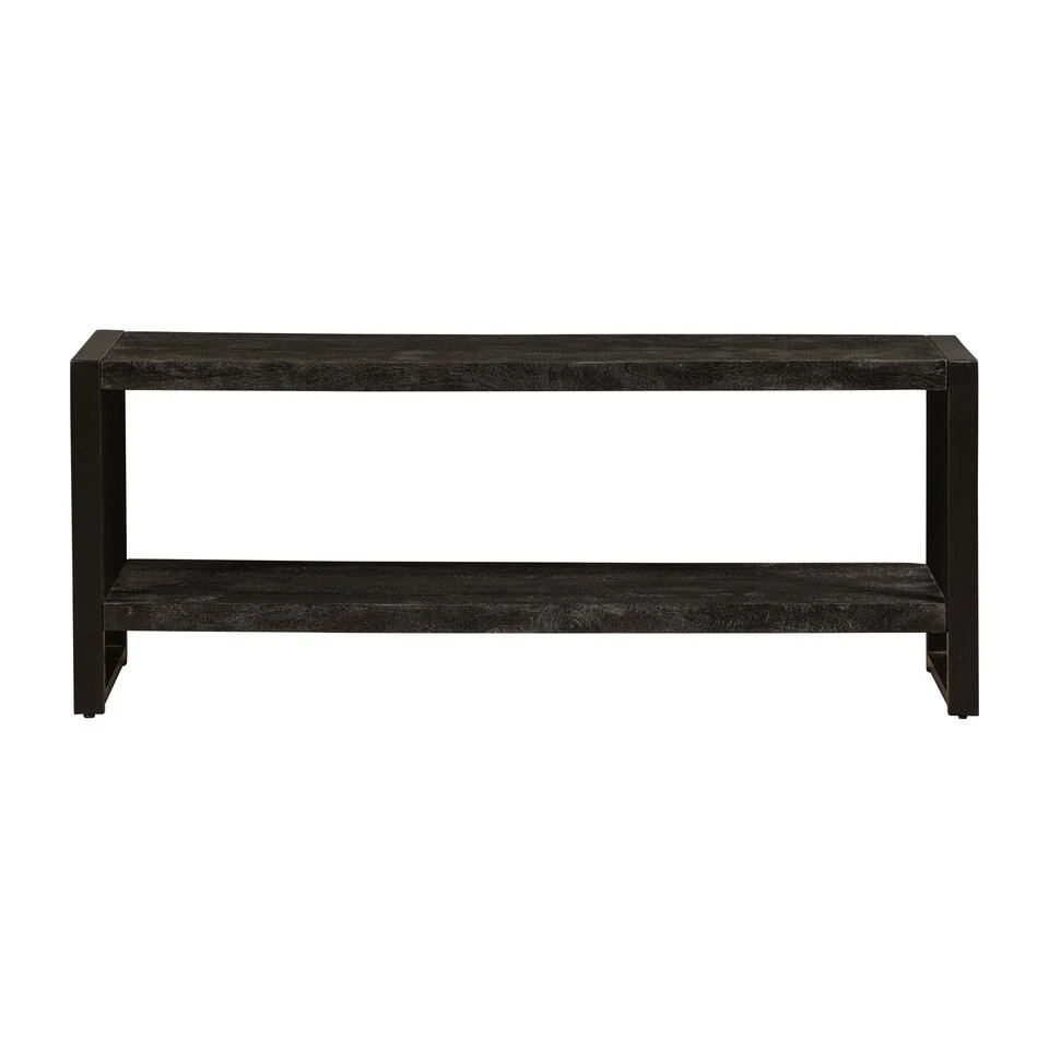 Het massieve mangohout is eerst gezandstraald, daarna behandeld met zwarte verfbeits en tenslotte afgewerkt met een donkere, natuurlijke bijenwas om het hout te beschermen tegen vocht, vuil en kringen. De stalen poten zijn behandeld met een zwarte poedercoating.