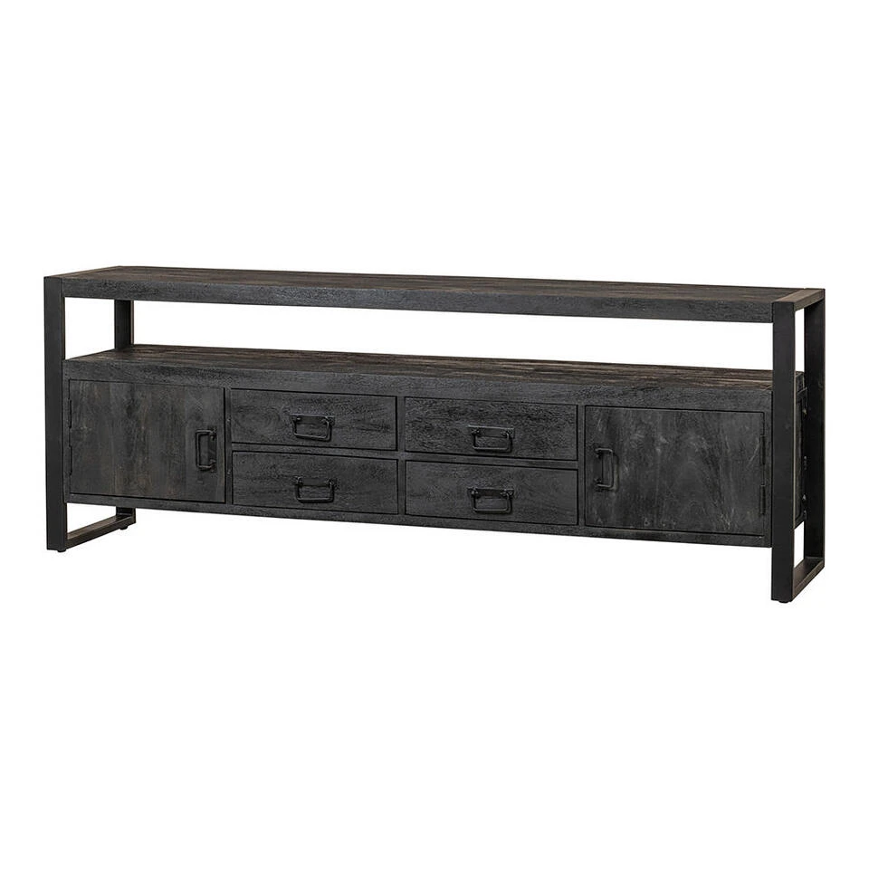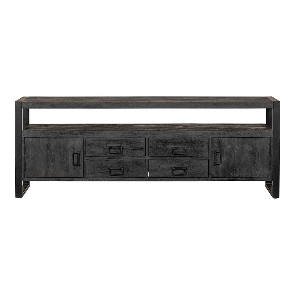 Het Seattle Black-televisiemeubel is een groot en ruim televisiemeubel dat er ook nog eens fantastisch uitziet! De kast heeft een stijlvol uiterlijk door het unieke zwarte mangohout met de zwartmetalen accenten. Dit zal een perfect geheel vormen met de televisie! De kast beschikt over twee ruime vakken achter de deurtjes. In het midden bevinden zich vier lades waarin ook allerlei spullen kunnen worden opgeborgen. Het open vak kan benut worden om apparatuur te plaatsen zoals een tv-ontvanger of een geluidsbox, waarvan de kabels eenvoudig aan de achterkant kunnen worden weggewerkt.