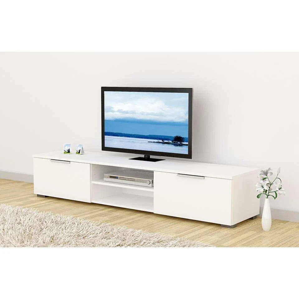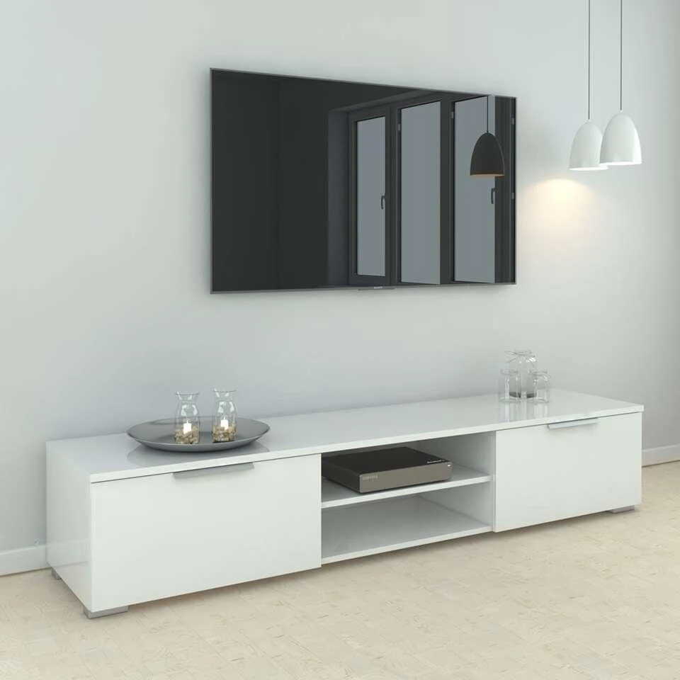 TV-dressoir Uldum is een modern meubel uitgevoerd in hoogglans wit. Het meubel is 33,1×172,7×39,9 cm en biedt ruimte aan je televisie en audio apparatuur. Achter de deurtjes leg je bijvoorbeeld CD’s en Dvd’s.