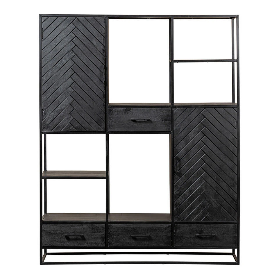 Deze mangohouten vakkenkast in het zwart is een lust voor het oog. Hij biedt voldoende opbergmogelijkheden met open vakken, lades en deuren en om de kast te decoreren met stijlvolle accessoires. De kast beschikt over vier deuren met stijlvol visgraatmotief, vier lades en twee ruime open vakken met twee planken om allerlei spullen in op te bergen.