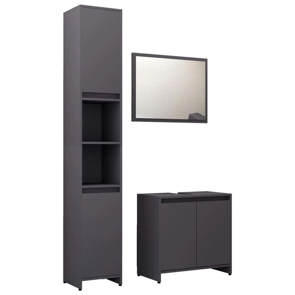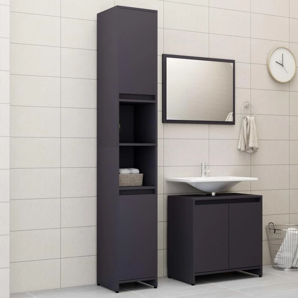 Deze stijlvolle meubelset, bestaande uit 1 hoge kast, 1 wastafelkast en 1 spiegel, heeft een prachtige, nette uitstraling en creëert extra opbergruimte in je badkamer.
