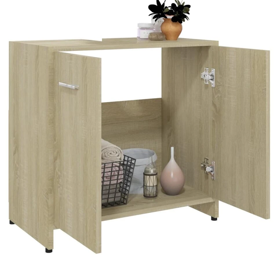 Deze chique kast is gemaakt van spaanplaat, waardoor hij stevig en stabiel is. De kast heeft 1 vak en 2 deuren en biedt voldoende opbergruimte om spullen in je badkamer op te bergen. Elke deur heeft een handvat voor gemakkelijk openen en sluiten. De kast is gemakkelijk schoon te maken met een vochtige doek.