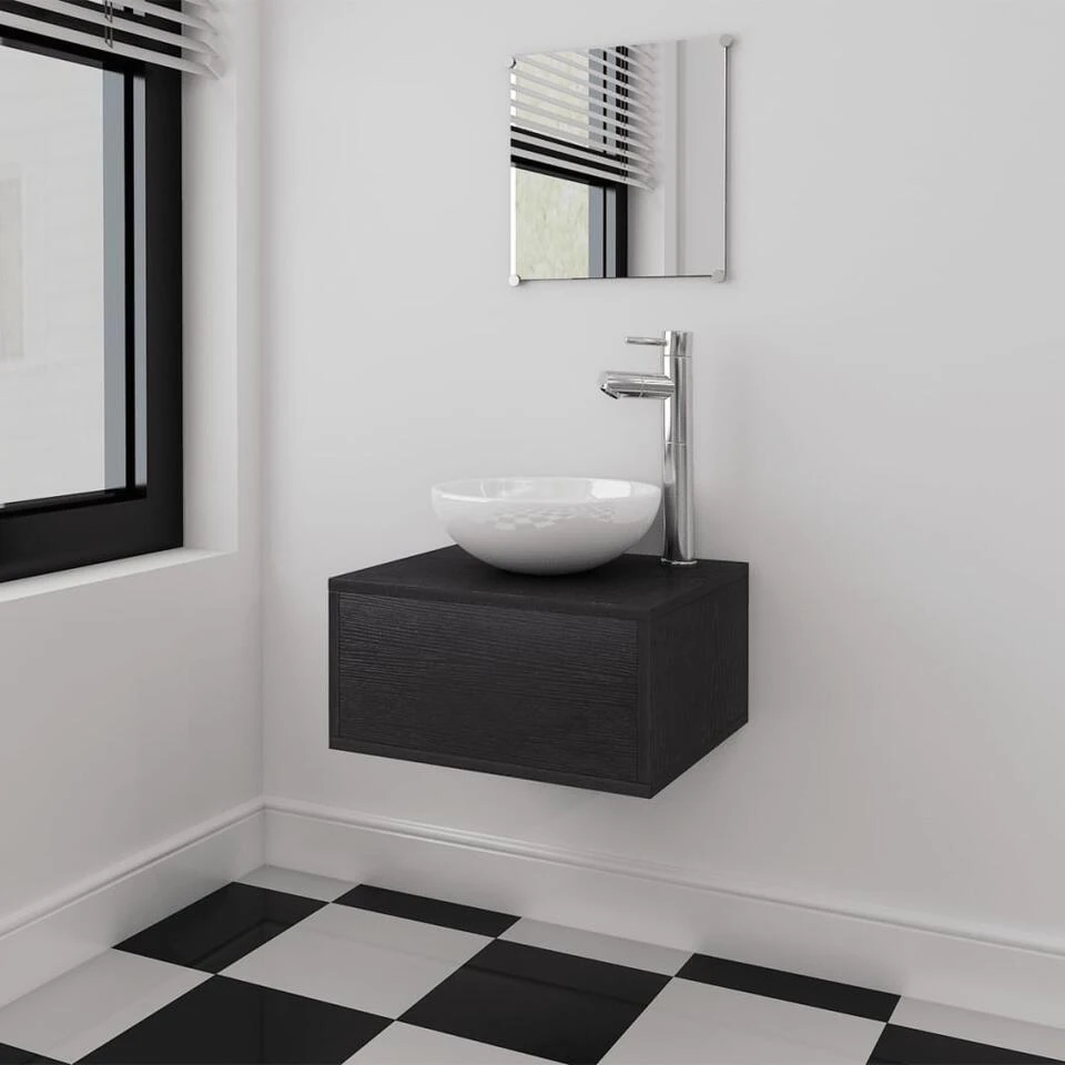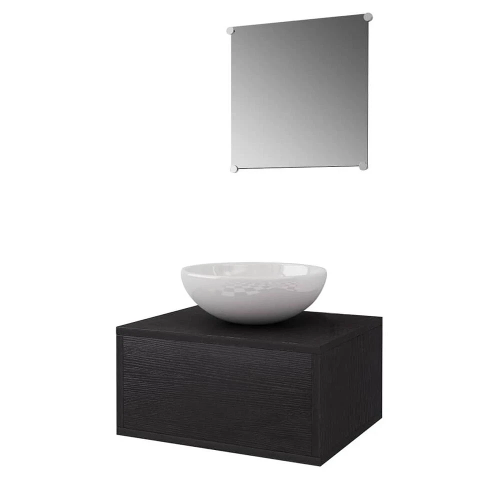 Deze badkamermeubelset wordt geleverd met een spiegel en kastje met wasbak. Het compacte formaat en minimalistische ontwerp maken het een ideale toevoeging aan iedere moderne badkamer. Gemaakt van kwalitatief hoogwaardige spaanplaat, is dit badkamermeubel zeer stevig en duurzaam.