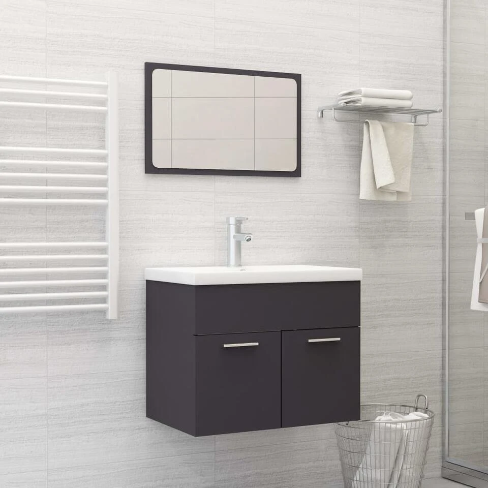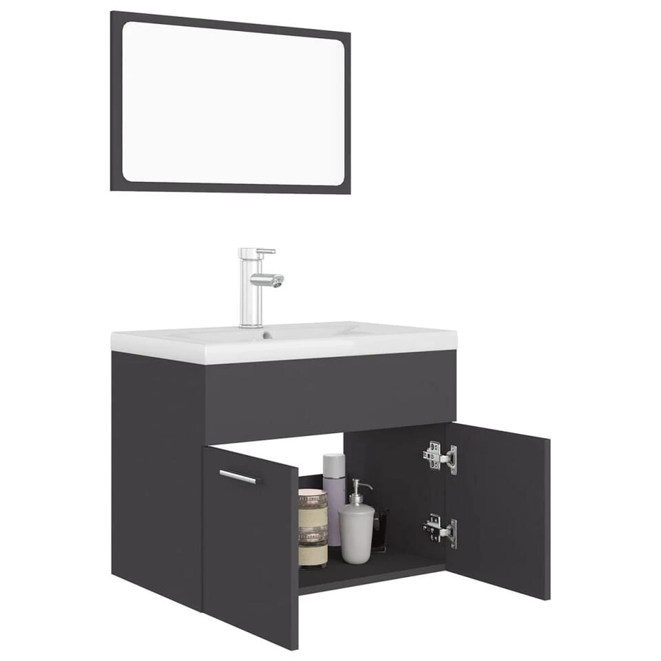Deze trendy badkamermeubelset, bestaande uit een wastafelkast, een inbouwwastafel en een spiegel, past perfect bij je badkamer of wasruimte. Hij heeft een opvallende, opgeruimde uitstraling.