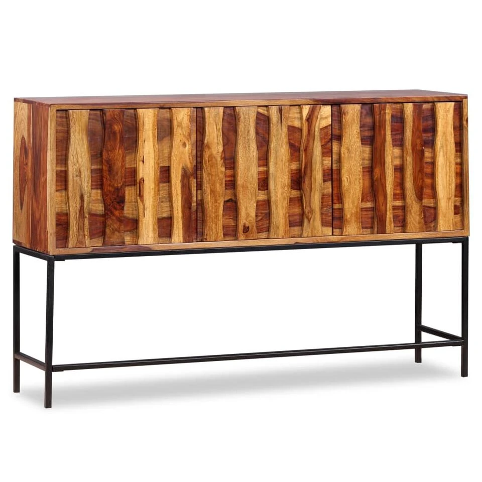 Dit dressoir is gemaakt van massief sheeshamhout. Sheesham wordt ook wel palissander genoemd en is een tropisch hardhout dat bekend staat om zijn mooie nerven. Deze kast heeft een stevig blad waar je een fruitmand, een vaas en andere decoratieve spulletjes op kunt zetten. De sterke, smeedijzeren poten dragen bij aan de stevige constructie. De kastjes bieden voldoende ruimte om allerlei kleine spulletjes georganiseerd en binnen handbereik te houden. Het dressoir is volledig handgemaakt, en de prachtige houtnerven maken ieder meubelstuk uniek en nét iets anders dan de rest.
