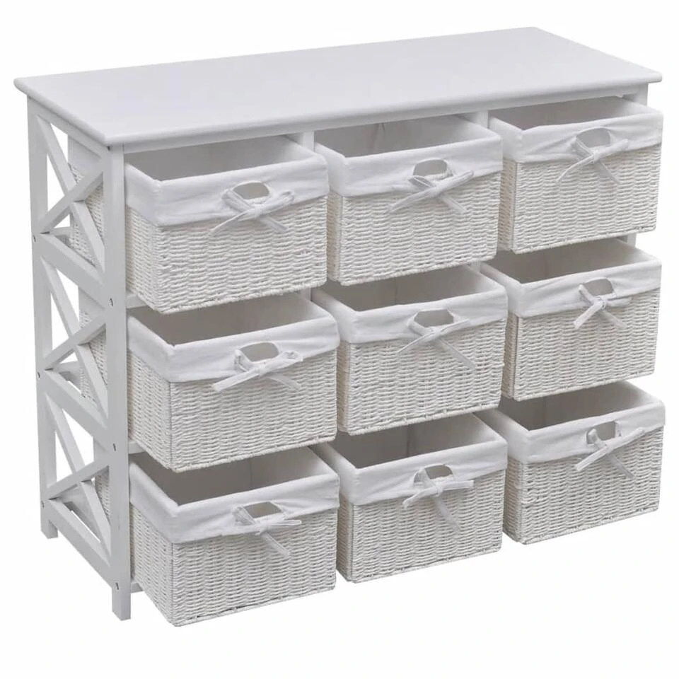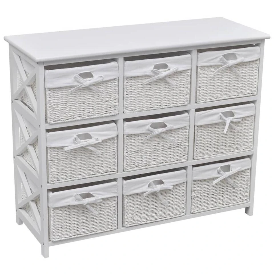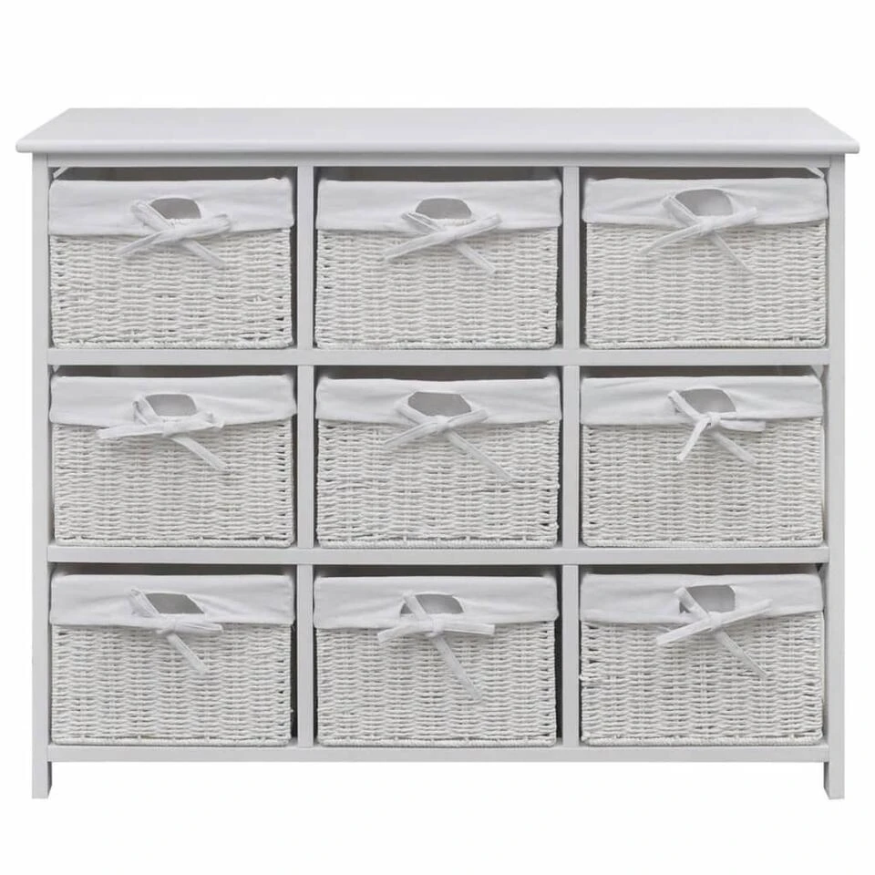 Deze kast heeft 9 geweven manden en iedere mand heeft een wasbare, stoffen voering. Dit meubelstuk is afwerkt met witte verf, waardoor het duurzaam en eenvoudig te reinigen is.