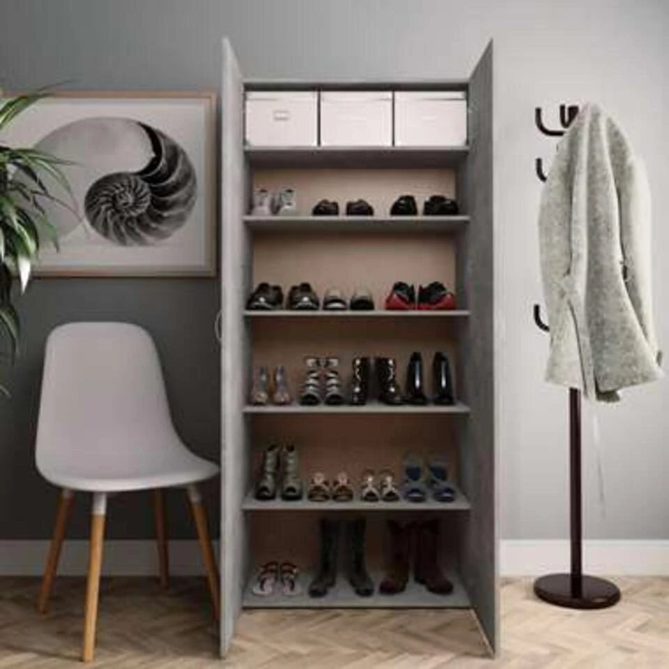 De halkast is gemaakt van bewerkt hout wat buitengewoon stevig en duurzaam is. De schoenenkast heeft 6 schappen, die voldoende ruimte bieden om je schoenen goed geordend te houden. Dankzij de 2 deuren beschermt de kast je schoenen tegen stof en houdt hij ze uit het zicht.