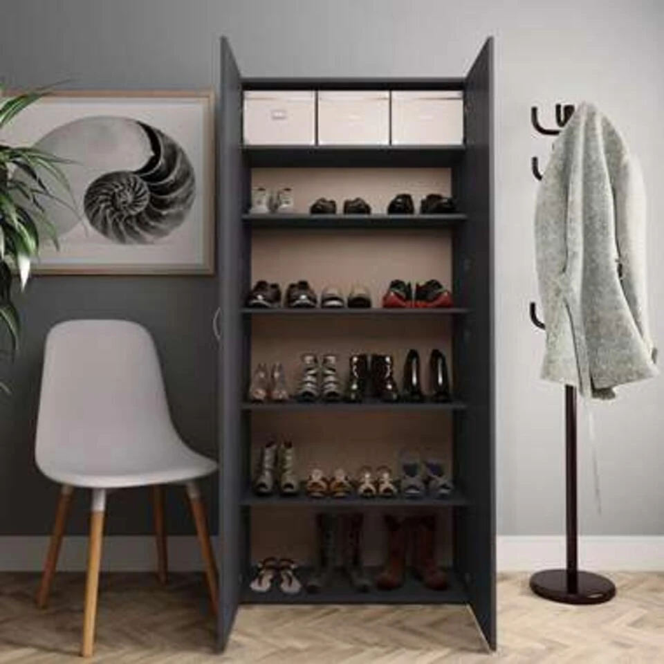 De halkast is gemaakt van bewerkt hout wat buitengewoon stevig en duurzaam is. De schoenenkast heeft 6 schappen, die voldoende ruimte bieden om je schoenen goed geordend te houden. Dankzij de 2 deuren beschermt de kast je schoenen tegen stof en houdt hij ze uit het zicht.