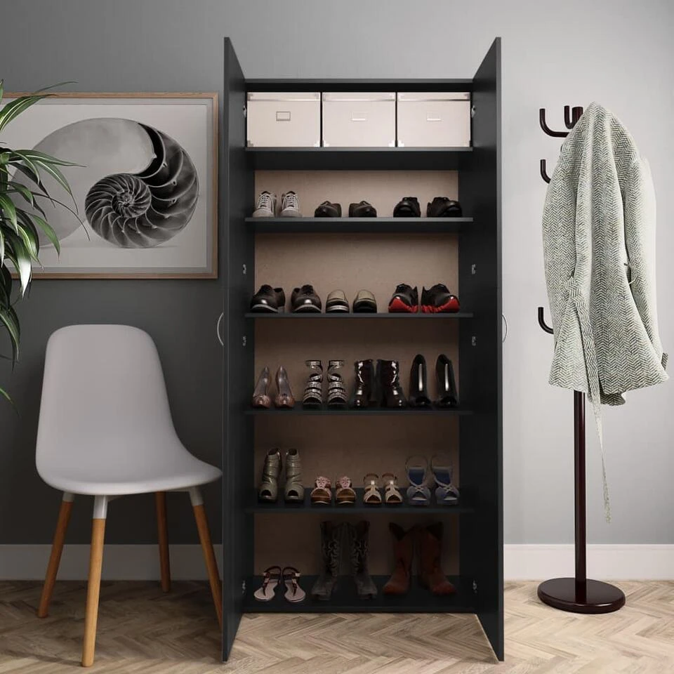 De halkast is gemaakt van bewerkt hout wat buitengewoon stevig en duurzaam is. De schoenenkast heeft 6 schappen, die voldoende ruimte bieden om je schoenen goed geordend te houden. Dankzij de 2 deuren beschermt de kast je schoenen tegen stof en houdt hij ze uit het zicht.
