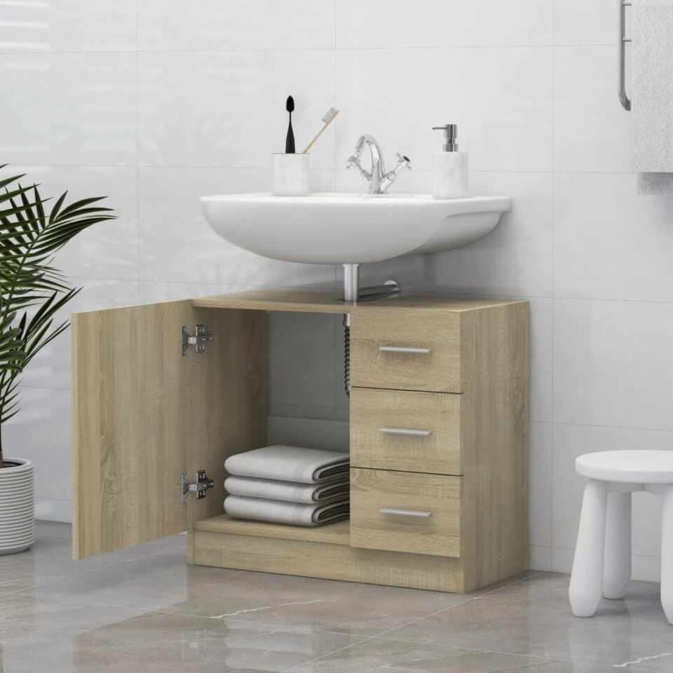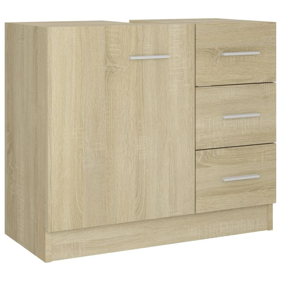 Deze kast is gemaakt van spaanplaat, waardoor hij stevig en stabiel is. De opbergkast heeft 1 vak en 3 lades en biedt verschillende opbergmogelijkheden en extra ruimte om spullen in je badkamer op te bergen. Het blad is ideaal voor het plaatsen van een wastafel. De kast is gemakkelijk schoon te maken met een vochtige doek.