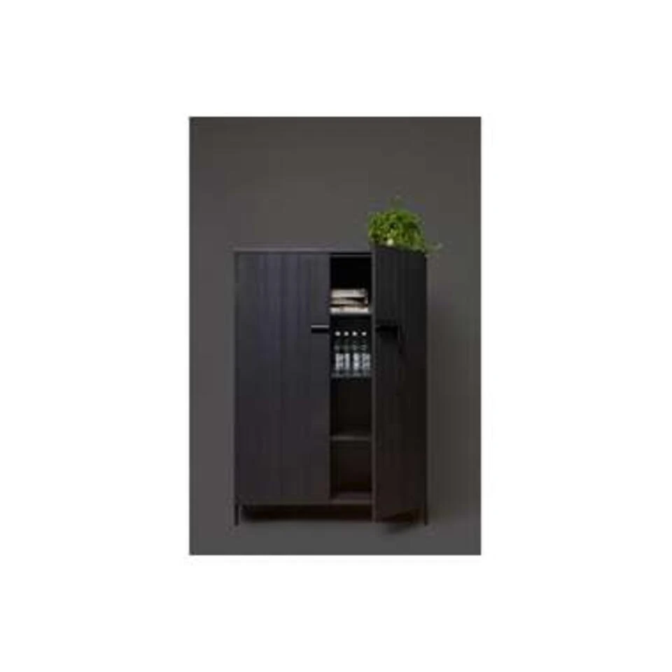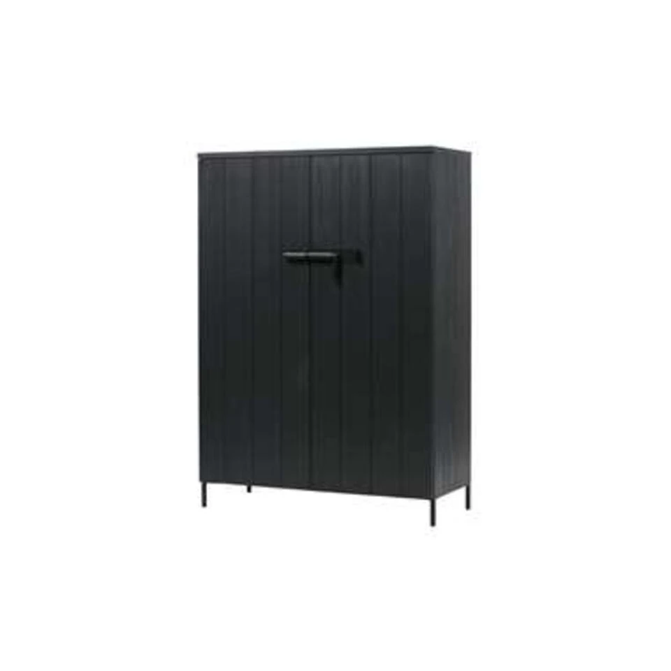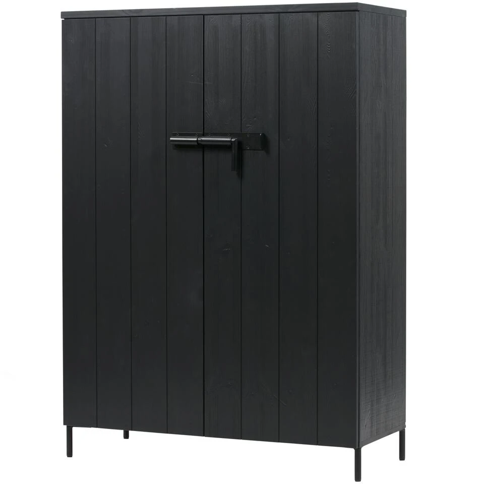 Deze stoere zwarte opbergkast Bruut van het merk WOOOD is een opberger die je gemakkelijk kunt toepassen. De kast is niet groot, dus past snel in de ruimte. Bruut heeft een breedte van 100 cm en is voorzien van drie brede opbergplanken, waardoor je er veel spullen in kwijt kunt. Doordat de kast niet heel hoog is (141 cm) staat de kast ruimtelijk in de kamer en kun je er bijvoorbeeld een leuke mand, schaal of plant op zetten zodat de kast past in de sfeer van de ruimte. Bruut is een basic kast met leuke details. De kast heeft namelijk een gave sluiting (metalen schuif) op de deuren, staat op metalen pootjes en de kast heeft een stoere geborstelde afwerking. Deze massief, FSC gecertificeerd, grenenhouten legkast is gespoten in de kleur diep zwart en de deuren hebben een verticale V-groef belijning.